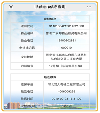 每臺電梯統一貼有二維碼,可根據二維碼查看該電梯的識別編碼、所屬使用單位、負責人聯系方式、維保信息、下次維保時間信息、年檢信息、是否正常運行、維修流程查詢。